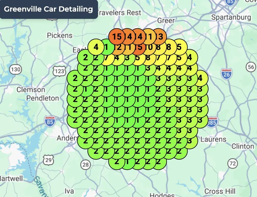 (Each dot represents someone searching "greenville car detailing" in that spot. The number represents their rank in Google)